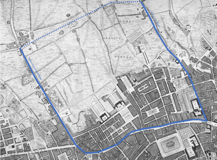 By 1795 development had reached further northwards and Euston Road had been newly built (then called ‘New Road’).